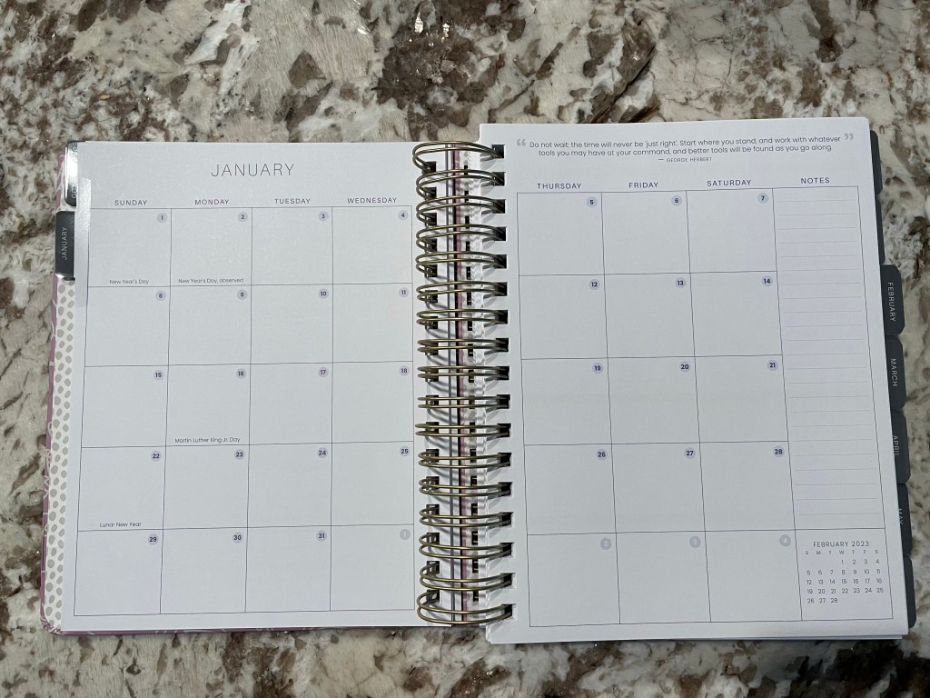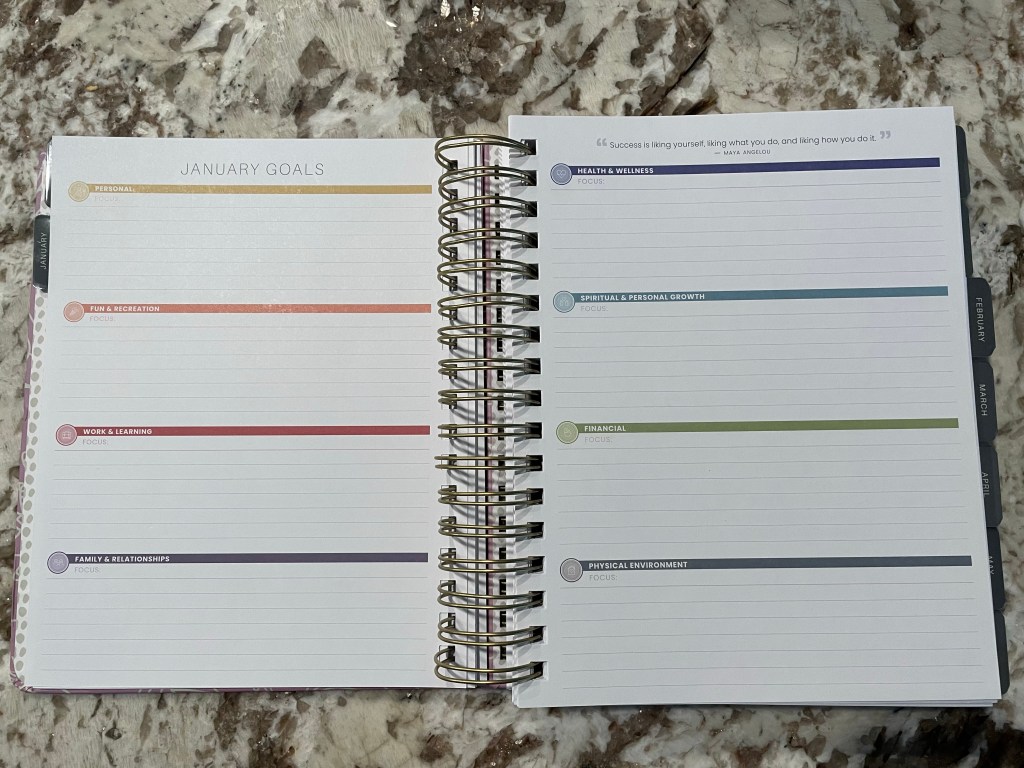 The purpose of putting the goal planning pages with the daily agenda pages is to keep your goals up front and plan out your days and actions with your goals in mind. Most planners keep the two separate or a goal planner company only releases a goal planner but not a daily agenda so this planner is unique in that it keeps the two completely together in one book.