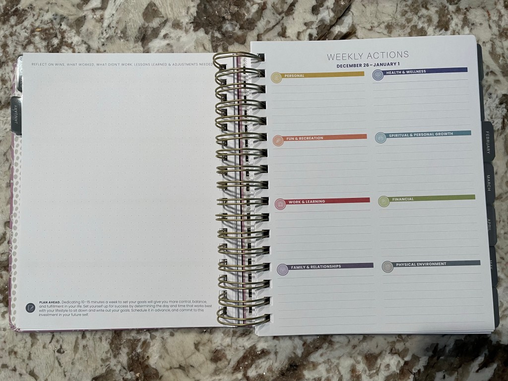 There are 8 areas of life in the book that are the areas for goals and weekly actions. That may sound like a lot but in my case, most of the 8 can overlap or each can have its own goal that ties in with a goal from another life area, especially since my life has one overarching theme in it right now which is motherhood. According to the company, you don’t have to use all 8 areas if that’s too much for you but each area is important to the facets of most individual’s life and goals.