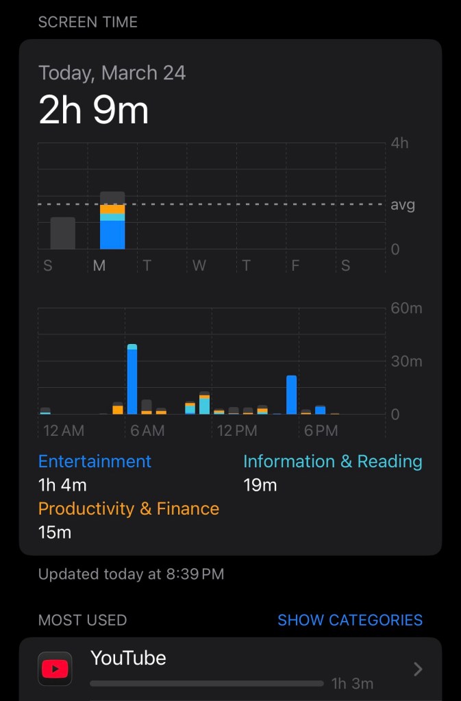 Today was a more typical day with listening to YouTube in the morning and the evening but it is still progress. The screen time app said that my daily average is down 76%!