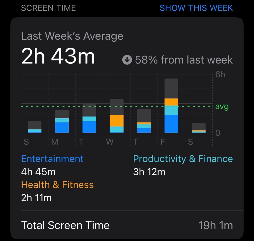 Even with the addition of health and reading tracking, my screen time for the week went down by 58% from the week before.